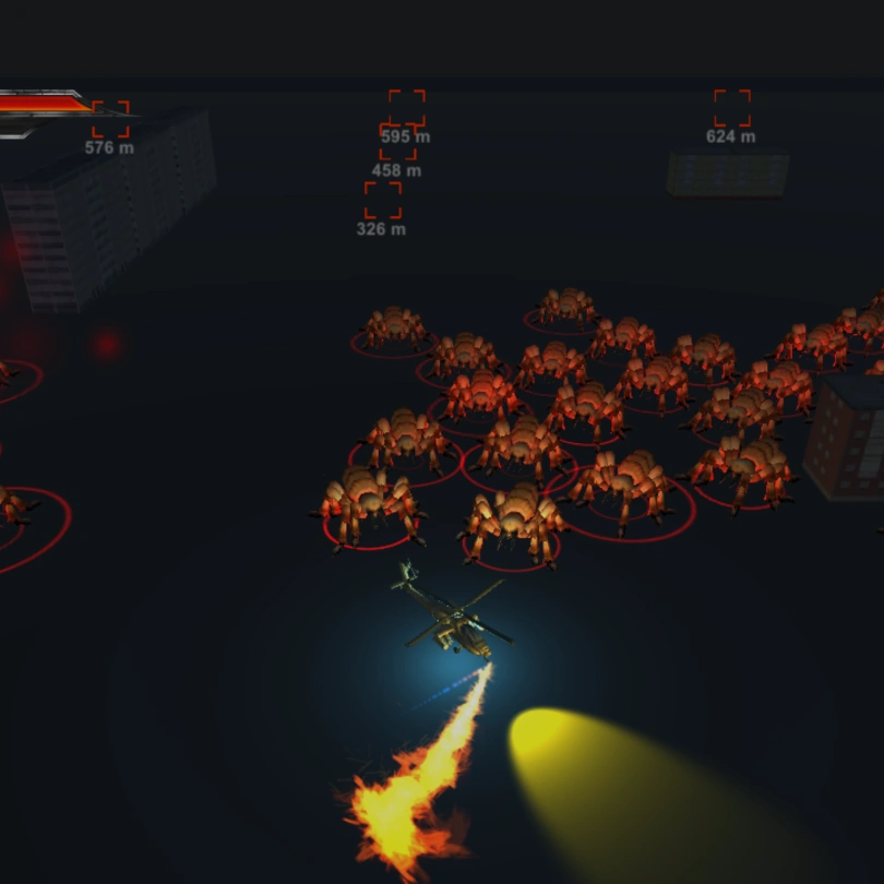 Chopper To Hell is a top down twin stick shooter, where big and large spiders are coming in via portals and your job is to kill them all.