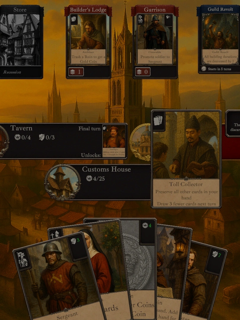 Build your city and expand your deck in CAEMDALE, a single-player deckbuilding roguelike. Plan your turns carefully, assemble a powerful deck, defend against enemy raids and encounter new strategical policies and disruptive revolutions in every run!