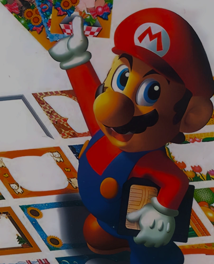 Mario no Photopi is a creative game / tool for Nintendo 64 that lets players design postcards, posters, and slideshows using Mario-themed clip art, fonts, and borders. Images can be imported via SmartMedia cards and edited or retouched, then exported to PCs or printing kiosks.